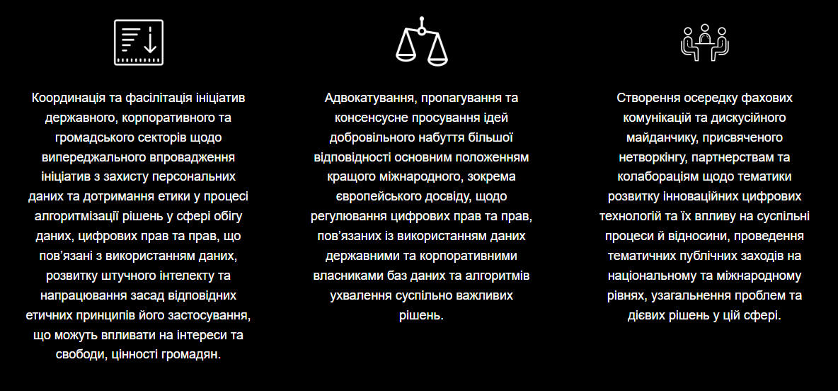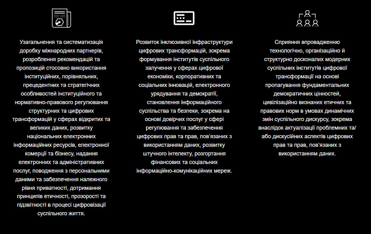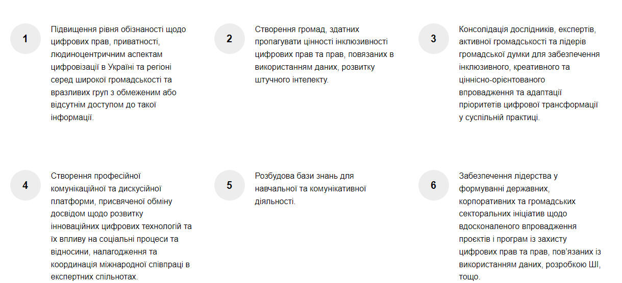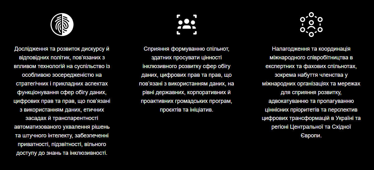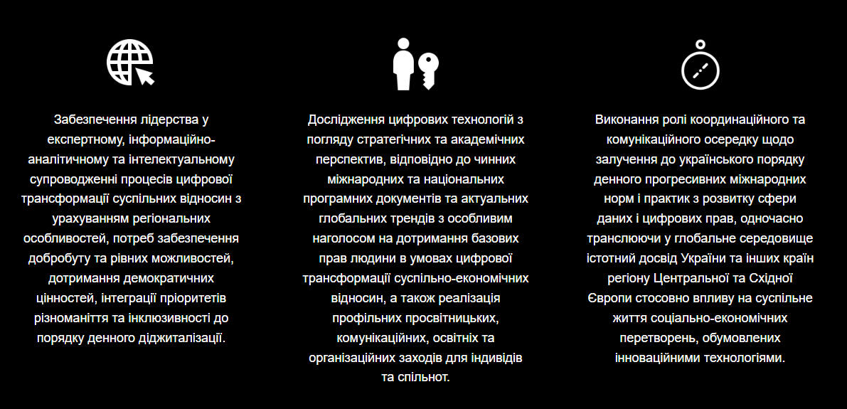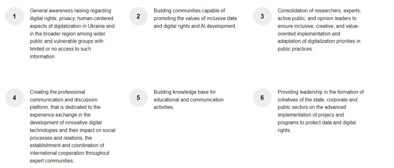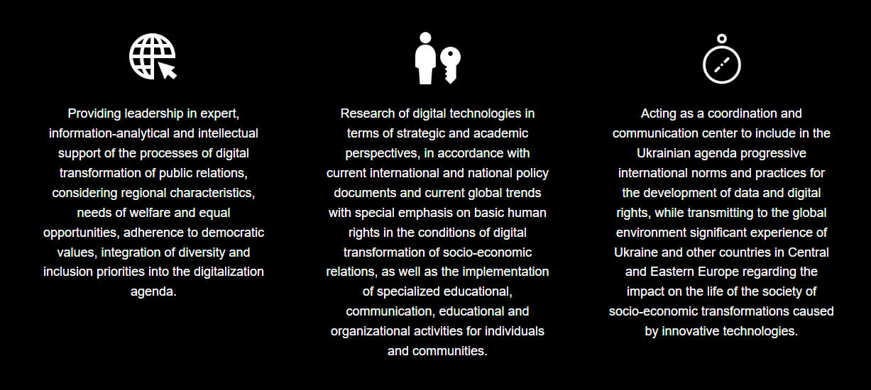 виконує роль координаційного та комунікаційного осередку щодо залучення до українського порядку денного прогресивних міжнародних норм і практик з розвитку сфери цифрових прав, повязаних із використанням даних, одночасно транслюючи у глобальне середовище істотний досвід України та інших країн регіону ЦСЄ стосовно впливу на суспільне життя соціально-економічних перетворень, обумовлених інноваційними технологіями.